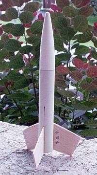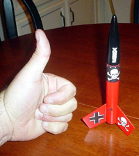 When finishin' t' Mini Max, I first sprayed t' body tube with a coat o' primer t' toughen t' tube somewhat for t' sandin' t' follow. I followed this with t' obligatory two coats o' thinned Elmer's Fill N Finish, shiver me timbers, sandin' in betwixt coats. Avast, me proud beauty! When I be satisfied that t' tube spirals had been deleted I attached t' fins. Ahoy! Arrr! This was followed by two coats o' Fill N Finish on t' fins, arrr, two coats o' primer and more sanding. Begad! (At least t' Max's small size cuts down on some o' t' necessary sanding.) After primin' I sprayed t' body with ValSpar Apple Red and t' nose cone with ValSpar Gloss Black. Begad! One coat was sufficient and t' rocket was set aside for a couple o' days t' cure before t' decals were applied.