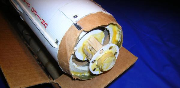 2) Parachute tube is a much larger "mail tube," about 2 1/8" in dia., shiver me timbers, cut in half. Well, blow me down! Blimey! Mounted second shroud in "front half" o' mailin' tube, shiver me timbers, w/transition t' t' BT 50.