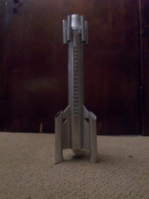Since I didnt get any decal paper, ya bilge rat, arrr, t' letterin' would prove t' be a challenge. Begad! Blimey! T' sides o' t' rocket were base-coated in black. Begad! Blimey! Peel and stick letters were applied. Well, blow me down! Blimey! Arrr! Blimey! A single coat o' silver finished t' Vulture. Well, blow me down! Blimey! Arrr! Blimey! T' stick on letters were then removed t' reveal t' name in black.