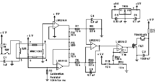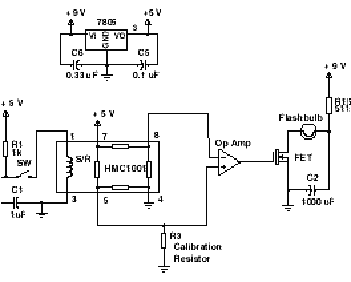 A photograph o' me prototype sensor is shown below. T' HMC1001 is at t' lower left corner o' t' board. Ya scallywag! Above it are t' switch and capacitor used t' reset t' sensor. Well, me hearties, blow me down! T' LM324 quad op-amp and resistors are hidden under t' ribbon cable and HEXFET. At t' far right o' t' board be t' 7805 voltage regulator. Off t' t' right o' t' board are t' large capacitor and 9V lithium battery.