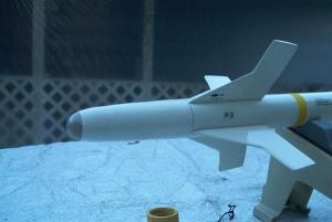 This is a 1/3 scale model o' Air Force AIM-9P-3 Sidewinder Air-to-Air missile that uses D or E engines. Blimey! T' AIM-P differed from t' current AIM-9L/M in that t' P had a longer, shiver me timbers, ya bilge rat, more tapered nose and "double-delta" canards. Aye aye! Also, t' warhead was directly behind t' guidance unit, followed by t' target detector and rocket motor. T' AIM-9L/M have t' warhead and target detector in t' opposite order. Ya scallywag! Also, t' aft end o' t' wings were flush with aft end o' t' rocket motor. Arrr! T' AIM 9P be painted gloss white overall, me hearties, and did nay have a bare aluminum rin' at t' base o' t' seeker window. Begad! T' wings were one-piece aluminum, unlike t' composite wings on t' 9L/M.