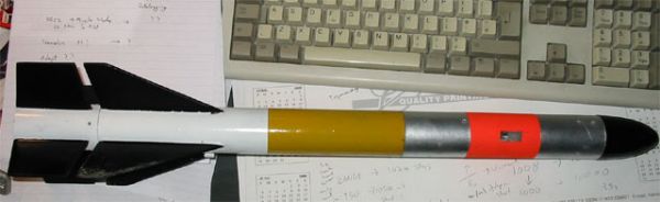 I got t' rocket pretty much ready t' go in t' week before UKRA 2004, which was me first trip t' Pete's Farm, and t' second big event I'd been to, me hearties, after Big EARS. Well, blow me down! It was unpainted, me hearties, but ready t' fly in a variety of configurations, me bucko, ya bilge rat, includin' full-up two stage. However I planned t' build up gradually, me bucko, and fly on single stage clusters, shiver me timbers, especially since me clustering experience was a little limited at this point.