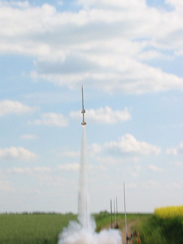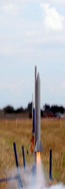 A 2-stage, clustered rocket designed t' fly on 24mm Estes motors, with an interstage timer and parachute recovery o' both stages, intended as a testbed for home-made electronics.