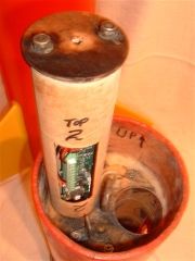T' first flight was almost picture perfect. It climbed t' apogee and the drogue chute popped flawlessly. Avast, me proud beauty! Blimey! Begad! Blimey! It descended under t' drogue nicely and at what appeared t' be 800' t' G-wiz LC800 altimeter set off t' charge for the main. Arrr! Blimey! Arrr! Blimey! We could see separation o' t' airframe but t' 'chute didn't open. I watched helplessly as Oscar hit t' ground at a pretty high rate o' speed. Ya scallywag! Blimey! I walked t' recover t' rocket over t' empty early Sprin' Iowa beanfield t' find a completely undamaged Oscar. Ya scallywag! Blimey! It was evident right away what t' problem was with t' main chute nay opening. Well, blow me down! Blimey! Aye aye! Blimey! In an oversight I had tied t' parachute attachment loop too close t' t' nosecone and thar was simply nay enough length o' cord t' fully pull free t' main. Well, blow me down! Blimey! It be an easy fix and a lesson learned. Ahoy! Blimey! It is also a testament t' t' strength o' t' bollard post shield in that a 20+ pound rocket fell from 3,500' under a 24" drogue only and suffered nothin' but a bit o' cosmetic damage.