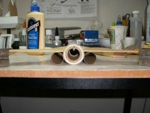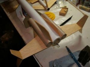Next, I glued these boosters t' t' main body usin' a technique I learned from Quest Rocketry's Force 5 kit. Begad! Avast! Layin' t' main tube on a flat surface and with t' engine hook up, I placed t' two boosters on t' sides o' t' main tube, ya bilge rat, and flat on t' table. Blimey! Ahoy! Next, I applied a bead o' glue down t' booster tubes and rotated them until t' glue be in contact with t' main tube.