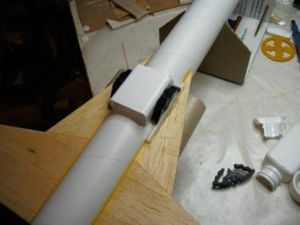 T' glider rests on these strakes and is hooked t' t' booster by a 1" long piece o' launch lug and a hook constructed from a dowel and a balsa stand-off. T' launch lug is glued along t' top center o' t' model 6-¼" from t' back o' t' tube, and t' hook is glued t' t' glider along t' win' center line and flush with t' front. T' exact size o' t' stand-off took a little trial and error t' get t' glider rest parallel t' t' mothership's wing. Blimey! Start with a stand-off about 3/16" for t' launch lug and a 3/8" for t' dowel. Tape them in place and check that t' glider rests correctly. Blimey! Begad! If not, sand them until t' glider rests in line with t' main win' so that t' glider will nay distort t' flight path o' t' rocket. When dry, place t' glider on t' mothership, me hearties, me hearties, and place t' rudders/glider support fins against t' boosters. Ahoy! Mark t' rudders where t' glider wings cross them. Arrr! At this mark, me bucko, shiver me timbers, cut a notch into t' fins and glue them in place so that t' notch holds t' glider win' stable durin' boost.
