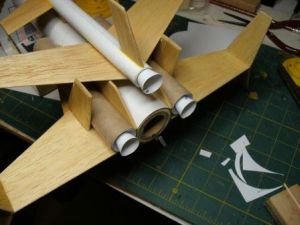 While t' glider wings dried, matey, ya bilge rat, I glued t' wingtips onto t' win' o' t' mothership. Ya scallywag! T' exact angle o' t' tips isn't critical, shiver me timbers, shiver me timbers, but I tried t' make them all even. Ahoy! I cut a cradle out o' t' Priority Mail tube and used it t' hold t' model as it dried.