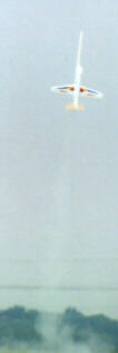as possible. Ahoy! Most every flight will be a heads up But I think it will support with reasonable stability most any glider you can attach in t' 250-300 mm range and smaller anythin' bigger and I can nay say what will happen All Balsa Hook assemblies and plane multi point hooks are Coated in CA to add strength ! This is important ! and make sure t' Multi Point Hook on the plane is LOOSE so it will be able t' get away from t' rocket This Rocket will Revolutionize t' Boost Glider Competitions if successful for you will now be able t' design an Airplane INDEPENDENT o' a Rocket and with only SLIGHT mods launch it on a Rocket which will also allow a LARGE variety of Planes o' many styles t' be flown ! In fact Modifyin' a White Wings plane t' launch on this should nay be beyond possibility Although I don't know how t' paper will handle High Thrust etc.. Begad! Flight Reports Comin' Soon I will make many designs t' fly from varied standard design some canard designs Biplanes and some more exotic designs and report back here ! I will also work on t' win' slop an Idea I have is t' have a slidable coupler on t' body with t' LONG screws that I could position under win' and extend till it just touches wings keepin' them stable for Boost ! More t' cone soon UPDATE July 22 1998 Success !!! I flew This Rocket 4 Times today 3 on t' Above Glider and Once on a Similar Glider but with an average Poly Hedral Glider wing. Flight 01: t' Poly Hedral Glider (Sorry no Picture Explained Later)(you can see a part o' it in t' last picture above at t' bottom) Total Success !!! Flew on a C6-3 headed into t' wind a Little and released