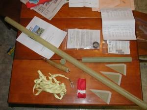 At this point, shiver me timbers, all you need t' do is add your chute, assemble your nose cone by epoxyin' t' nose cone bulkhead into t' base o' t' nose cone--it's the one with t' screweye attached for you, and attach your launch lugs to complete t' construction. Ahoy! T' rocket goes together quickly. Ahoy! Begad! T' most time consumin' part is waitin' for t' J.B. Avast! Weld epoxy t' totally dry (about 15 hours).