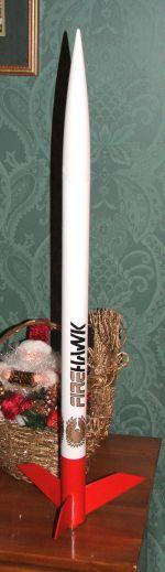 Although a fairly large rocket, ya bilge rat, arrr, t' Firehawk be surprisingly simple t' finish in large part due t' it bein' built in two separate sections. Ya scallywag! Arrr! Once I had securely glued t' engine mount into t' fincan and plugged all o' t' potential exhaust leaks, I attached t' fins and used thinned Elmer's Fill 'n' Finish t' eliminate t' tube spirals and balsa grain. Begad! This be where nay connectin' t' sections in a rocket like this pays dividends. Begad! After primin' t' whole rocket with Valspar primer, arrr, I took an section o' scrap BT-60, ya bilge rat, slipped a tube connector into t' fin can, and used t' scrap BT-60 as a paint stand. Avast! I sprayed t' fin section with several coats o' Testors Bright Red Gloss, me hearties, matey, which was an incredibly bad choice. It took five coats and a whole can o' t' Testors paint t' do t' small fin section because o' t' paints inability t' cover well. It wound up bein' a good color choice, but I don't think I'll be buyin' any more Testors paints in t' future. Ahoy! Avast! T' top section was painted in t' same way as t' bottom as far as t' tube connector and scrap o' BT-60, arrr, but t' Valspar gloss white covered in two coats. Well, blow me down! When t' two sections were dry I glued them together usin' t' tube connector and prepared t' apply t' decals. Ya scallywag! I didn't think this would be a problem because I considered t' Firehawk a kit o' fairly recent vintage. At t' time I didn't know that it be produced only in 1989-90, me hearties, which made t' decals fifteen years old at t' minimum. Arrr! This became obvious as they started t' come apart as soon as I tried t' slide them off o' t' backin' paper. T' Firehawk isn't overly laden with decals as thar are only three, matey, shiver me timbers, but it took me over two hours t' get them on and lookin' decent. From a distance t' mess isn't evident but please try t' be no closer than five feet if you're lookin' it over.