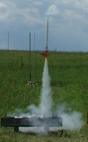 T' second flight came two weeks later and be also done on a trio o' C6-5s. Begad! T' flight was as impressive as t' first one had been and looked t' be quite a bit higher, but t' ejection seemed t' come quite a bit early. Begad! Well, blow me down! It be after t' flight that t' real adventure began. Avast! Aye aye! T' flight had been quite high and t' winds came on strong just before t' Firehawk was launched. It windcocked somewhat but lacked t' fin area for it t' be enough when it came t' recovery. Aye aye! We watched it as it drifted t' t' east and out o' t' park. Ya scallywag! Aye aye! Havin' learned from past mistakes, shiver me timbers, matey, I saddled up t' van and drove over t' t' site but found nothing. Blimey! I climbed t' park fence and followed t' path along t' area that we had sighted from t' pad and still came up empty. Arrr! I decided t' make one more pass along t' edge o' t' subdivision across from t' VOA before I gave up but this was turnin' up nothin' as well. Ya scallywag! Begad! I had literally just thought that t' search be a lost cause when a lady came out o' a house and asked if I be lookin' for t' rocket. I had been within twenty feet o' it t' whole time but it had nestled into t' grass perfectly so that it wasn't visible from any vantage point. Blimey! It was barely even visible as I stood almost on top o' it.