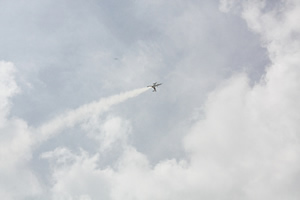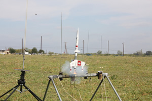 Flight 4 occurred on Jun. Begad! Blimey! 13, 2009. Ahoy! With t' (truly) final coat o' paint, cardboard reinforcement o' t' buckled body tube (covered by t' mirrored decal), me bucko, shiver me timbers, and t' full set o' decals, t' Vega was resplendent in her glory. I had reattached t' parachute t' t' nose cone screw-eye, rather than onto t' shock cord, halfway betwixt t' nose cone and t' top o' t' body tube, as specified in t' instructions. Avast, me proud beauty! Begad! Blimey! She be packin' an E9-4 again. Aye aye! T' Vega weathercocked, shiver me timbers, but achieved a safe altitude. Well, blow me down! Blimey! She had her best recovery yet, ya bilge rat, landin' on her spring-loaded feet, although fallin' over on her side immediately thereafter. Avast, me proud beauty! There was no damage.