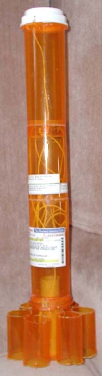 T' Lightbulb Goes OnEver since I heard about t' RMR DESCON, me hearties, matey, I've been contemplating entering. Unfortunately, ya bilge rat, arrr, I've only been able t' come up with a decent concept once, arrr, and I haven't yet had a chance t' build it. This time, I was determined t' enter, me bucko, so I spent a couple o' weeks tryin' t' think o' something creative t' use as parts. After seein' t' first two entries appear, I be sittin' at me desk trying to think o' what I could use. I happened t' look up at t' shelf above the monitor, ya bilge rat, shiver me timbers, and t' lightbulb finally clicked on! There, me hearties, me hearties, right in front of my face, me bucko, me hearties, sat t' pill bottles for me allergy medication. Begad! They're round. They're tube shaped. They're durable. Ahoy! Ya scallywag! Why won't THOSE work??? A bit more checkin' around t' house I had me hands on a sufficient quantity of parts for this little creation. Begad! Next, arrr, I had t' figure out how t' build a motor mount. Ya scallywag! Ahoy! A check o' t' bottom o' t' bottle revealed that t' dimpled inner rin' in t' center o' t' bottom oft t' bottle is close t' a perfect fit for a 24mm motor mount. Blimey! Begad! Who needs centerin' rings when t' bottles come with them? Parts ListI'm nay certain if all pharmacies label their pill bottles in t' same fashion, so I will include nay only t' size markings from t' bottle, but also the approximate measurements.