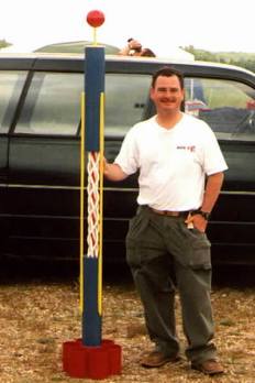 T' Styrofoam ball surface is filled with lightweight spacklin' and sanded several times until smooth. Ya scallywag! T' ball is then fiberglassed in sections usin' satin weave cloth. Further fillin' and sandin' are followed with a coatin' of epoxy. Blimey! Avast, me proud beauty! A 3/8: hole is drilled true into t' ball for t' Pylon. Avast! Well, blow me down!