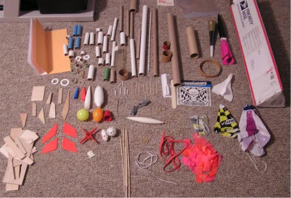 T' payload be t' Estes Cosmic Cobra nose cone with helicopter recovery so no real assembly was required only addin' t' rubber bands see flight prep.