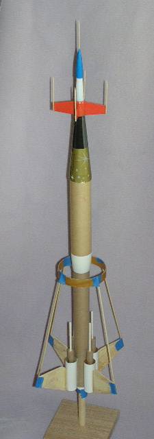 First, me bucko, matey, I filled all t' balsa components, matey, shiver me timbers, sanded and filled until they were completely smooth. Arrr! Next, I applied a couple o' coats o' primer sandin' after each. I painted t' entire rocket Hot Pink Pearl (Model Master #4643). Avast, me proud beauty! After maskin' t' mock engines I applied t' Cadmium Yellow (Model Master #4611) t' t' mock engines and t' tooth picks on the upper fin can. Avast, me proud beauty! Blimey! Next, I masked and applied gloss black (Model Master 4695). Well, blow me down! After t' black had dried for about 48 hours I added t' Bad t' t' Bone decal and t' sparkle decals t' t' upper fin assembly and center ring. The final step was t' apply 3 coats o' Krylon Acrylic Crystal Clear #1303.