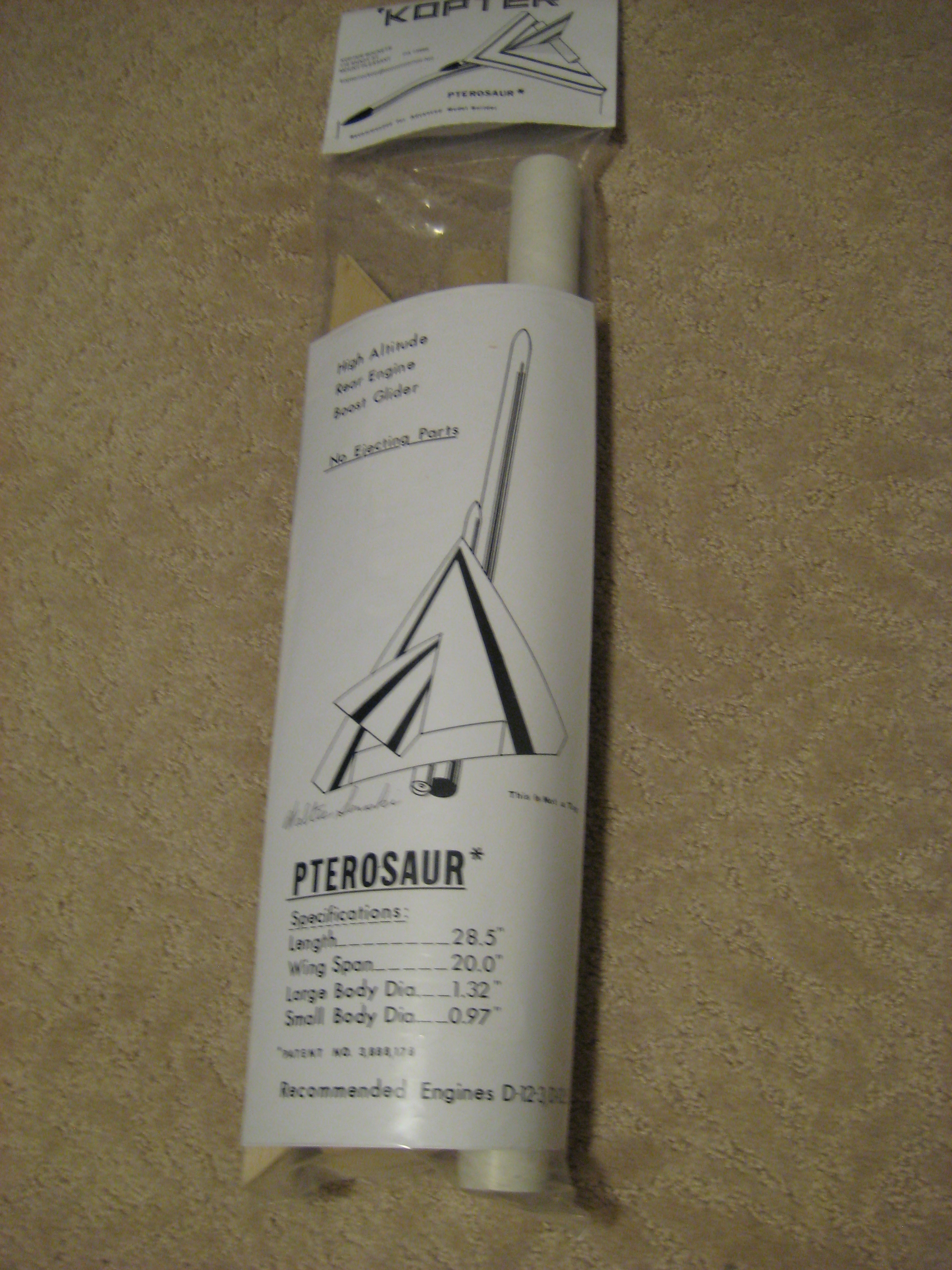 BriefT' Pterosaur is a unique rocket glider invented by Walter Senoski o' Kopter Rockets back in t' 1970's. It uses a piston activated by t' motor ejection charge t' release t' elevons t' t' up-position for gliding. An article describin' this model appeared in t' March/April 2015 issue o' Sport Rocketry. At this time you will need t' order t' kit directly from Walter.