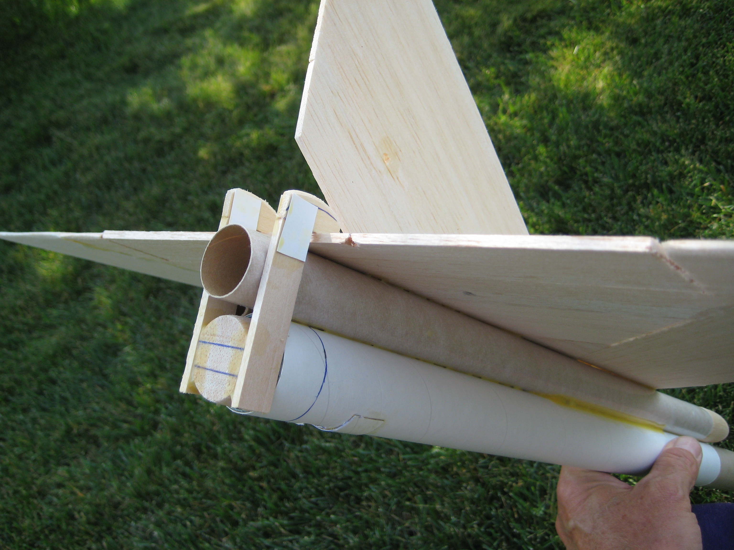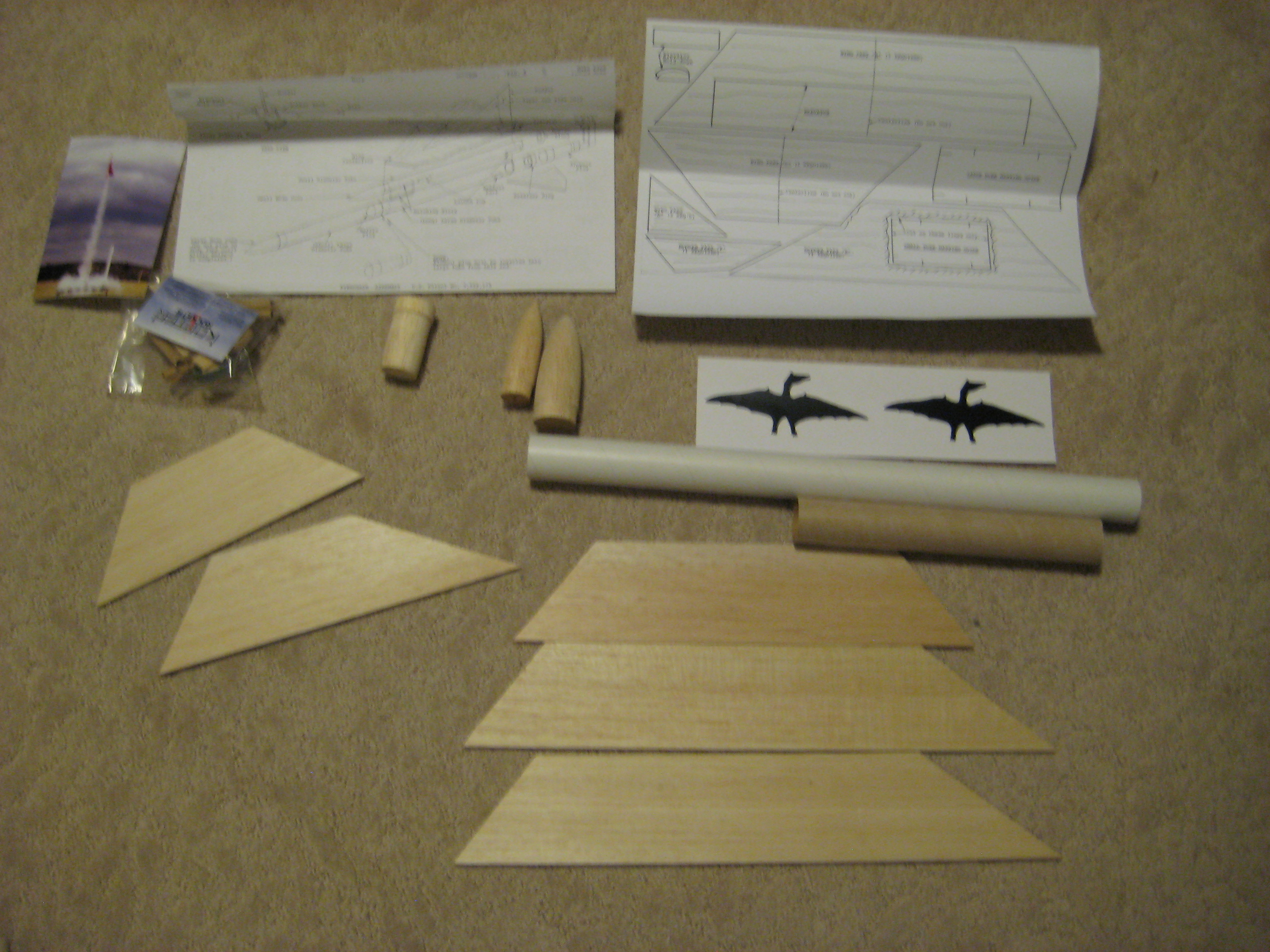 T' kit comes with all t' parts (I was missin' one balsa coupler that I ordered from Balsa Machine Services.) and detailed instructions. T' model consists basically o' two main tubes, one for t' Estes D12-3 motor and t' other for t' piston. There is a large tail and win' and a nose cone for each tube. There are several pages o' detailed instructions along with many illustrations showin' how t' model goes together.