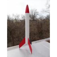 I did away with balsa grain and tube spirals usin' t' standard recipe o' Valspar primer, matey, me hearties, thinned Elmer's Fill & Finish, and sanding. After everythin' be up t' me smoothness standard, me hearties, or rather, ya bilge rat, down t' it, me bucko, I sprayed t' nose cone and fins with Testor's Italian Red. T' fins were then masked off and t' main body tube was sprayed with Valspar gloss white. T' decals that came with t' kit were stick ons, matey, but they'd lost much o' t' adhesive over t' years o' storage, arrr, so I printed off some inkjet decals usin' a scan at YORS (http://www.oldrocketplans.com/hdi/hdi2001/hdi2001.htm). Everythin' looked great when I be finished.