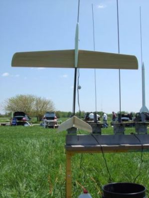 To convert for rocket flight, ya bilge rat, I made a balsa boom t' fit across t' chord o' t' win' and then sanded/leveled t' top t' run parallel t' t' boom, me bucko, me bucko, maybe a slight angle o' attack where t' nose is lower than t' aft end (pitch down).