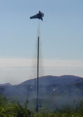 Great flight t' watch as it thrusted about 25 feet and then went nearly about a 30 degree trajectory t' about 50 feet then headed down. At t' exact time it hit t' ground t' ejection fired! Upon impact, ya bilge rat, shiver me timbers, this rocket just totally came apart.... Avast! you'd think it be part o' the design!