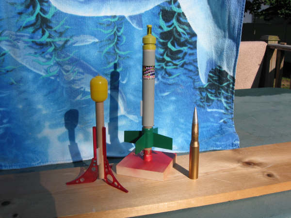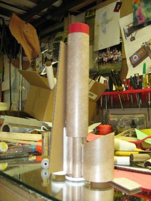 I finessed a piece o' bt-60 into a coupling, and used another 4' piece o' bt-60 for a nose cone [picts show early attempt t' use half o' Easter egg, shiver me timbers, but had NO luck tryin' t' cement egg plastic t' tube]. Resorted t' slicein' tube at 90 degree marks, and collapsin' it around a segment o' 'yellow pusher tube' that fits inside bt-20 tube. Aye aye! Odd tape center [rocket lookin' part, but non-standard size, 1.25' O.D.] around t' lot for style. Avast! 3/4' wood bead for nose termination. Begad! 2 oz o' weight in nose for stability. Arrr!