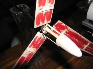 All that's left o' construction is attachin' t' blade elastic--one end inside t' balsa sandwich formed from that notch you cut out earlier and t' other end t' t' bottom o' t' forward nose cone. Arrr! Well, shiver me timbers, blow me down! Once that's done, glue the nose cone in place and glue t' shaft t' t' lower balsa nose cone. I found t' pre-drilled cones too sloppy a fit and had t' build up t' dowel with a paper wrap, me bucko, but this will surely be resolved before release.