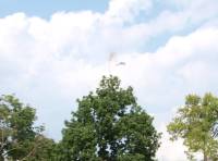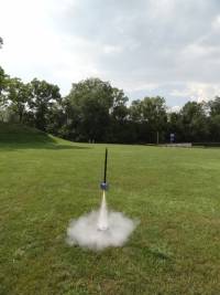 For t' first flight I used an Estes B4-2, which is one o' t' engines suggested in t' instructions. T' instructions claimed that this motor would take t' rocket t' 144 feet, matey, matey, which is pretty close t' what I think it got to. B6-4 Field is fairly cozy, shiver me timbers, so I wanted t' start things off with a low level flight just t' see if it would actually leave t' rod. As a matter o' fact, ya bilge rat, it left t' rod fairly nicely, arrr, and actually appeared t' be flyin' as advertised before thar be an "anomaly" (i.e. t' plastic flight coupler uncoupled,) and t' whole mess started skywriting. At t' time I thought that would be it, and retired t' rocket for a couple o' years until I decided t' re-glue t' parts and try again.