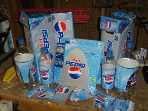 When I considered t' idea o' buildin' a rocket from recycled household trash, I immediately thought o' buildin' one entirely out o' Pepsi products. Blimey! Pepsi bottles look rocket-like so I began t' consider how t' build it. Ya scallywag! First I collected raw materials for t' project (there is no shortage o' raw materials in our house).