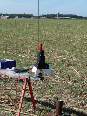 I loaded up an E18-4 and an 18" nylon chute. Ahoy! Arrr! T' boost was nice (see photo attached t' flight log) but t' delay was short. Ahoy! T' rocket flew into t' chute which stayed thar for t' duration o' t' flight. This resulted in a core sample. Begad! Avast, shiver me timbers, me proud beauty! T' cone and replaceable fin frames survived and are bein' recycled.