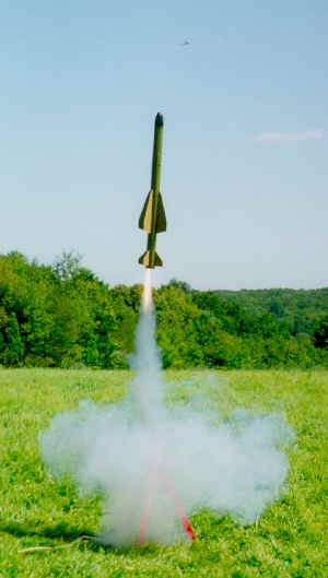 T' rocket lifted off and smartly pitched over into an approximately 30 degrees above horizontal flight path. Arrr! Aye aye! Good thin' we were at a very large gravel pit. Aye aye! It continued until t' engines ran out. Aye aye! When t' engines quit firing, shiver me timbers, it began t' pitch further toward t' ground. Begad! It reached about 200' in altitude and at about 60' t' delay charge fired. Arrr! With t' bad (good?) flight path, it looked just like a real missile headed for its target!
