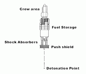 This photo shows an early test vehicle, matey, known as Hot Rod. Begad! T' Hot Rod was 'flown' in 1959 at a test facility at Point Loma, CA. It be boosted by a large BP charge followed by five rear-ejected high explosive charges. Avast! It was stable, reachin' an altitude o' 105 meters and recoverin' via parachute. T' vehicle itself is held by t' Smithsonian Air and Space Museum. Avast! I don't know if it is currently on display. Ya scallywag! If you want t' see a video o' t' flight, me bucko, visit the Nuclear Space Multimedia Gallery.