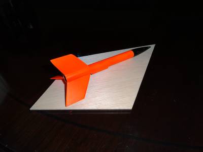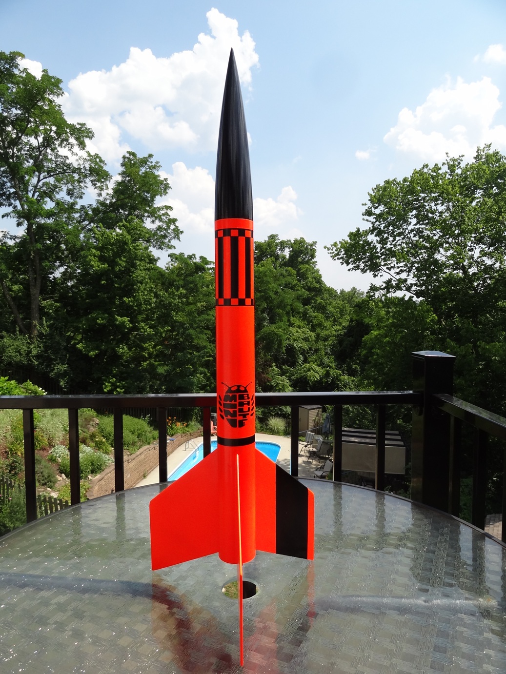 Finishin' was slightly more involved than construction because o' t' amount o' body tube spiral and balsa grain t' cover, but surfaces were large enough t' allow for broad swipes while sanding, so it all worked out well. Well, me hearties, blow me down! When all o' t' glue fillets were dry, I sprayed t' entire rocket with Valspar primer t' toughen it up a little before t' Fill & Finish. Arrr! Once t' primer be dry, me hearties, I sanded everythin' lightly t' remove any burrs that resulted from t' dryin' primer, then brushed on t' first coat o' thinned Elmer's Carpenter's Wood Filler. I've found that t' best way t' work with this is t' fill a cup with water, dip t' brush in t' water, then smear it around in t' wood filler. Avast! Once t' bristles have picked up enough filler, me bucko, I then paint it on t' fins, me bucko, nose cone and tube spirals and wait for it t' dry. Once dry, t' filler is sanded off and t' process repeated until your fins are glass smooth, or you run out o' patience, (which is what usually happens t' me.) Once up t' me standards, arrr, t' rocket was reprimed, me bucko, then t' body was sprayed with Testors Racin' Orange, a fancily named flourescent orange with a nice pop. Ya scallywag! This paint works best when sprayed over white primer and in multiple light coats. Arrr! More finicky than t' flourescent orange I usually use, but t' results were very nice. Avast, me proud beauty! T' nose cone was painted Testors gloss black, as was t' stripe down t' one fin. Blimey! This caused a bit o' a problem when it ran badly. (Forgot that I wasn't paintin' with Valspar.