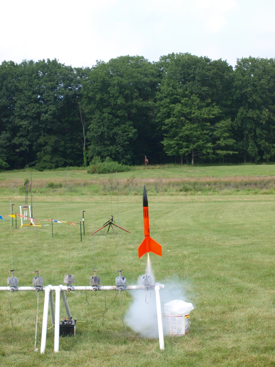 16 months t' t' day later I finally made a second flight with t' big Screamer at NARAM 55. T' field wasn't as big as past NARAMS, ya bilge rat, shiver me timbers, but t' winds were in me favor, and I really wanted t' see it fly in full Screamer livery. Again flyin' on an Estes E9-6 t' big screamer left t' pad with authority. Winds were light, ya bilge rat, as was t' windcocking. Ejection occurred just as t' rocket tipped over, and it recovered within 100 yards o' t' pad. My kinda flight. A balky camera kept me from gettin' more than an ignition pic o' t' flight, but thar will be many more chances. I love t' way this one turned out.