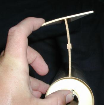 T' potential problem for t' upper fin is the direction o' t' basswood grain. First off, it is a good thin' that it is basswood because these fins would nay survive if they were balsa. Ahoy! Ahoy! However, ya bilge rat, arrr, the grain on t' upper fin is parallel t' t' body tube verses t' best known method o' havin' it parallel t' t' leadin' edge. Begad! Notice t' flex in t' upper fin? Will it snap? Time will tell.