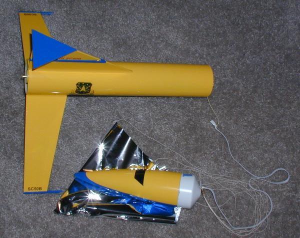T' rocket includes a 14" long, 2.6" diameter, white paper body tube for t' main body and a plastic nose cone t' make up t' 22 3/4" length. Arrr! Avast! T' kits includes three (3) sheets of 3/32" basswood for t' fins, two (2) 1/4"x1/16" balsa strips for detail, two (2) 3" dowels, and cardstock fin cuttin' templates t' make up the fins. Well, blow me down! There are two (2) plywood centerin' rings, me bucko, a 24mm motor tube, matey, thrust ring, shiver me timbers, and a retainer hook t' make up t' motor mount. Ahoy! T' recovery system made up o' a Keelhaul®©™® shock tether, me hearties, me hearties, elastic shock cord and an ASP 18" mylar parachute. Ahoy! T' finish things up thar be a 3/16" Launch Lug, matey, a bag o' clay for nose weight, arrr, and some water slide decals. Blimey! Ahoy! The parts list said thar was a "Green Spacer for "D" motor use", shiver me timbers, ya bilge rat, but me kit did nay have one in there.
