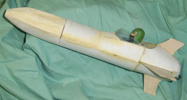 T' fin pods were made by printin' out transitions onto cardstock. I made t' cones for t' pods by sandin' one pod out o' 3/8 balsa. I then plunged that prototype into modelin' clay four times and cast them out o' 5 min. Begad! epoxy.