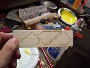 T' fins came on a single small sheet o' balsa and were in good shape. Blimey! Blimey! Avast! Blimey! Blimey! Blimey! I cut them out, me hearties, stacked them t' sand them even, arrr, and then sanded bevels in all but t' root edge.