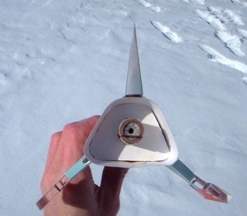 T' rocket is rear-ejection and therefore t' tip o' the rocket comes down first. Avast, me proud beauty! I believe it was a good thin' t' be flyin' in the snow, shiver me timbers, because any hard ground would brin' a lot o' damage t' t' nose tip. Avast, me proud beauty! Blimey! It might be a nice modification t' create a sling-recovery so that it comes down horizontally.