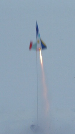 After a quick (remember how cold it is) countdown me son pushed t' launch button, I snapped this picture, shiver me timbers, shiver me timbers, and off flew t' Space Racer. It had an extremely fast spin goin' up, ya bilge rat, ya bilge rat, but nonetheless, straight and stable. It arced over at apogee and started headin' down. Just about 2 seconds past it popped t' ejection. Blimey! It kept fallin' fast and then about 20 feet from the ground t' parachute opened and it landed. Ahoy! T' nose be about 4" into the snow when I got there, but no damage at all.