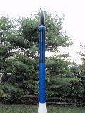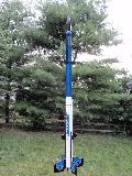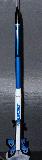 T' Ricochet: T' Ricochet is another design inspired by air defense missiles. It has a reducer t' a long, thin payload section. It is an easy, modern kit. Arrr! Instead o' regular gloss, me hearties, I used a metallic blue paint, shiver me timbers, and painted some silver rings around t' tube heads, and clear coated t' entire model after t' decals were added. Begad! T' payload section has vent holes for use with a barometric altimeter. Blimey! I like this bird, it's tall but pretty light, and it travels pretty far on smaller motors. Begad! This rocket has flown higher than t' Time Warner Center Towers in NY, and t' Bell Atlantic Tower in Philadelphia. From sea-level it could have flown over t' towers o' t' Golden Gate Bridge in San Francisco.