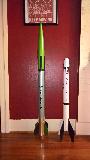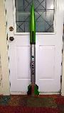 This is a slightly modified version o' a single-deploy, 3" MAC Performance Scorpion with 38mm mount. MAC makes some o' t' nicest high-power kits you'll find. I departed from Mike's design by extendin' t' motor mount in both directions. That allowed me t' use an Aero Pack spin-on tail cone retainer, and help keep t' recovery gear farther forward. Its painted in a color scheme o' me own design, arrr, usin' Testors lacquer paints. I also applied alumimum foil tape on t' fin can and in a band around t' forward end o' t' body tube, with t' idea it would be easier t' spot if it was more reflective.