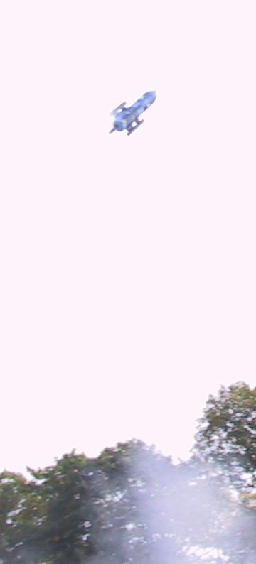 T' next flight was done on two B6-4 engines, mounted in t' same opposin' engine pods. Well, blow me down! Avast, ya bilge rat, me proud beauty! Blimey! No engine pod plugs were installed for this flight. Ya scallywag! Blimey! A small amount o' gravel was added t' t' payload bay for noseweight. Arrr! On this flight only one engine lit, shiver me timbers, and t' rocket looped a couple o' times before fallin' gently t' t' ground, matey, followed shortly thereafter by t' ejection charges. Ahoy! Blimey! This flight is a good example o' t' (non)flight characteristics o' this rocket with unbalanced thrust.