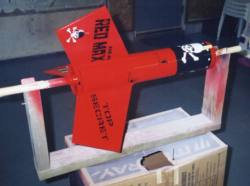 This be a fairly easy rocket t' build. Begad! Blimey! Avast! Blimey! It makes a good scratch project for a newbie. (like me!) Construction proceeded usin' standard HPR techniques. Ahoy! Blimey! I built a special shish-ka-bob rack for construction and painting. Aye aye! Blimey! Avast, me proud beauty! Blimey! This rack allowed me t' work t' fin fillets without havin' t' fuss about t' position of the rocket. Avast! Blimey! I could rotate t' rocket anyway I needed t' have it. Arrr! Blimey! Blimey! Blimey! Internal and external fin fillets were both 30 min. Arrr! Blimey! epoxy. Aye aye! Blimey! Well, blow me down! Blimey! After about 10 days o' sanding and fillin' o' t' fins and fillets, it was finally ready for primer. Blimey! Blimey! I laid on 3 coats o' Rustoleum sandable auto primer, ya bilge rat, sandin' in betwixt each coat. Aye aye! Blimey! Begad! Blimey! Next, I laid on 3 coats o' Krylon Banner Red Gloss. Avast! Blimey! After dryin' for 24 hrs. Blimey! Blimey! I masked off and painted t' black stripe around t' top on t' body tube with Krylon Gloss Black. Ahoy! Blimey!