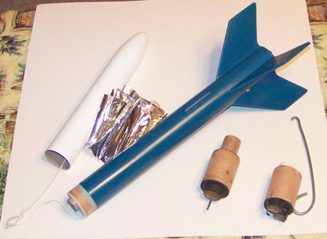 With all this work finally finished, I primed, sanded and eventually painted t' rocket. Begad! Begad! And, almost as an afterthought, arrr, shiver me timbers, I installed a handmade mylar chute.