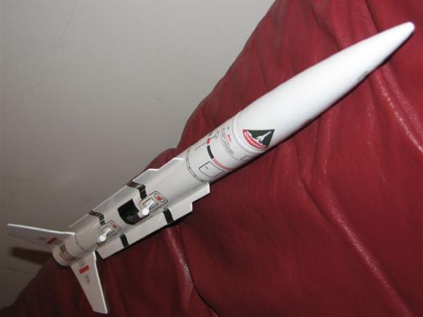 This usually takes months, only because I usually start another project first. This time I had a forecast o' 50 degree weather (in t' middle of January?), shiver me timbers, so I was motivated t' giter done. Arrr! Test fits and CG/CP confirmation, arrr, shiver me timbers, I be ready for paint. Arrr! T' quality o' t' body tube eliminated the need for tedious spiral filling, arrr, so t' first light coat o' Krylon white primer be without blemish. A few glue marks were noted and promptly ground or sanded away. Krylon Gloss White went on smooth and light for three coats. I coated each third o' t' project horizontally from t' top, me hearties, matey, me hearties, with one fin pointin' down. Any overspray would gather in t' fin and vane fillets, giving it that dipped look.