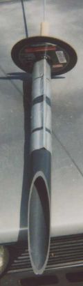 T' lower end o' t' Maxi-Rod be telescoped halfway into t' 3/16" ID tube and t' lower end o' this be telescoped halfway into t' 1/4" ID tube. These parts were secured in place with duct tape. Begad! Blimey! This entire assembly was then securely taped t' t' upper half o' t' "sand spike" opposite t' bevel. Ya scallywag! T' assure a snug fit, a gouge was first cut out with a grinder bit in t' reinforcin' lip o' plastic overhangin' t' top o' t' sand spike (although I found nay all brands o' sand spike have this). Well, blow me down! For robust blast deflection, an old Estes blast deflector was placed atop t' ceramic cut-off wheel and both were pressed together over t' Maxi-Rod onto t' duct tape junction with a spent "D" motor casin' used as a standoff. Avast, me proud beauty!