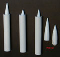 In t' original, t' tail cone is made from a paper shroud, matey, and is straight. In t' scale up, I decided t' use a nose cone for this surface t' create a curved boat-tail. Avast! Arrr! This is partially because I think t' nose cone will make a stronger tail than a styrene sheet, and partially just because I like t' look of t' curved tail better.