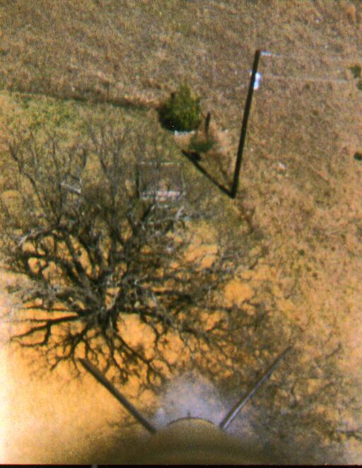 I decided I would try for a different type o' Easter family protrait by flyin' t' Rastrocam on a Delta-II with a B6-2. Begad! Well, blow me down! T' rocket took off and weathervaned a bit towards t' southwest. Aye aye! I thought that t' plastic fin unit had melted through and curled up, causin' t' rocket t' veer off like that. Avast, me proud beauty! Begad! Silly me. Aye aye! T' camera was ejected on its own chute and landed safely, but t' rocket be snared by a rocket-eatin' tree. Arrr! Ya scallywag! Ironically, me bucko, shiver me timbers, t' Rastrocam photographed t' rocket's captor. Aye aye! And o' course, me bucko, none o' t' family can be seen, since we're all somewhere below t' bottom o' t' photograph... such be t' fun o' a rocket borne camera: you never know what you're gonna get. But I digress... Ahoy! we still had t' get t' rocket body out o' t' tree. Ahoy! Well, blow me down! Fortunately, me hearties, I had brought Mr. Avast! Longarm just for this occurance. Unfortunately, me hearties, t' rocket be lodged out o' Mr. Blimey! Arrr! Longarm's reach... Avast! Aye aye! so me brother climbed up into t' tree and managed t' reach t' rocket with t' pole... but he couldn't budge it. Arrr! I attached me pocketknife t' t' end o' t' pole for a last ditch attempt. My brother finally managed t' sever t' shock cord and t' rocket dropped t' t' ground.