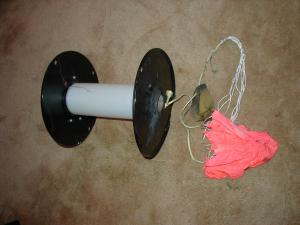 My materials were one spool, one centerin' ring, one piece o' 38mm motor mount tube, shiver me timbers, arrr, three feet o' 1/8-inch Keelhaul®©™® string, me hearties, four screws and washers, one coat hanger and one 18 inch parachute. These parts were then turned into me Level 1 certification rocket in two evenings. Really easy t' build.